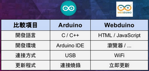 A6 : Webduino本身是OpenSource技術 ,Webduino開發板本身是Arduino Pro Mini + WiFi (ESP8266),和Arduino相比主要是開發方式的差異,如下圖