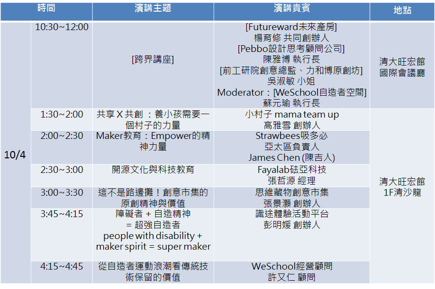 A10 : WeSchool 這次特別取經外國的 Maker faire ,展現人人都可以是 Maker 的自自造者精神,特別結合了在地的手作市集、生活市集等讓整個 Maker faire 更有趣,更生活化,務必親身體驗,感受 Maker 的活力